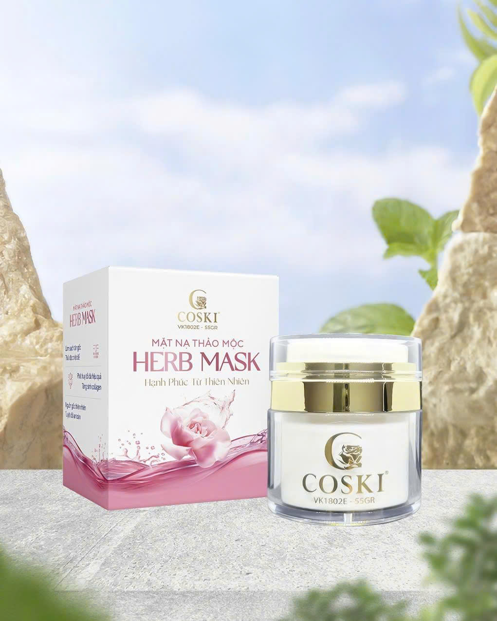 Mặt nạ thảo mộc Herb Mask COSKI là sản phẩm thiên nhiên đa chức năng. Công thức đặc biệt: vừa cung cấp dưỡng chất cho da, vừa giúp da đào thải độc tố và các chất cặn bã như : chất nhờn, mụn cám, bụi bẩn, tế bào chết và các lớp trang điểm. Từ đó làm cho lỗ chân lông luôn thông thoáng và dần dần được thu nhỏ, giúp làn da ngày càng mềm mại, mịn màng, trắng hồng một cách tự nhiên. Sản phẩm là sự kết hợp giữa nhiều loại tinh chất thảo mộc với khoáng chất tự nhiên và được sản xuất trên dây chuyền thiết bị hiện đại đạt tiêu chuẩn ISO 9001 và chứng nhận c-GMP. Herb Mask COSKI tự hào là một trong số rất ít những sản phẩm trên thị trường có khả năng thải độc cho da một cách triệt để và làm sạch mụn cám một cách nhẹ nhàng mà không cần sử dụng các phương pháp lột mụn, hút mụn, hay nặn mụn. Từ đó bảo đảm cho làn da luôn mịn màng và không bị tổn thương. Sản phẩm được phân phối rộng rãi tại các spa, cửa hàng mỹ phẩm và hệ thống phân phối trực tiếp của COSKI trên toàn quốc.